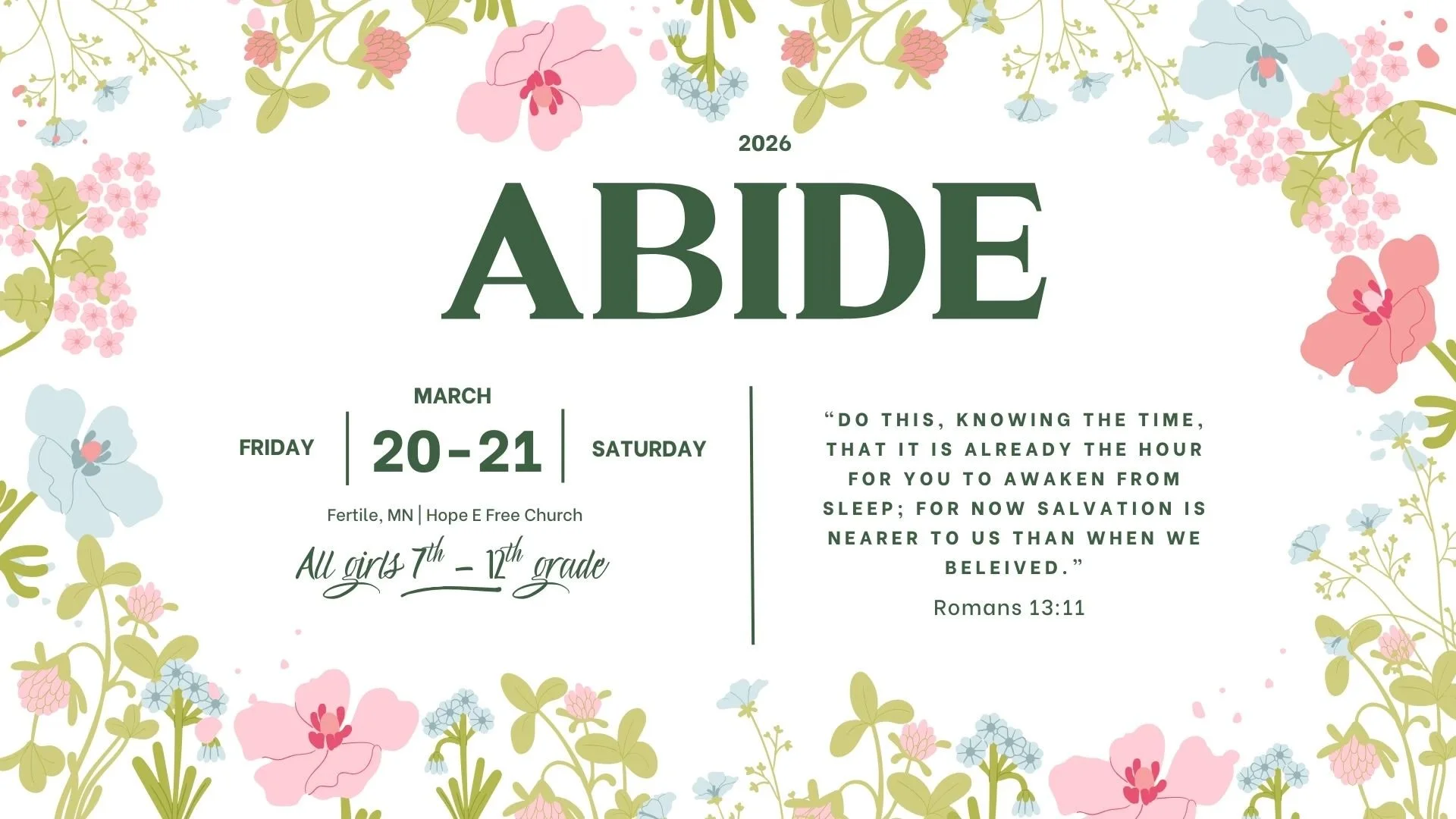 ABIDE is a non-denominational overnight event for teen girls in 7th-12th grade that was designed to help young women flourish amid the darkness and lies the world covers them with on a daily basis. We want to help bring joy, purpose and meaning to their relationships by discussing and bringing light and love to heavy topics that can confuse and weigh them down with uncertainty. We know that the world has corrupted and warped the beautiful design that God has for purity, sex, relationships and marriage. During ABIDE weekend, we spend intentional time illuminating, dismantling and rejecting the lies and replacing them with life- giving GODLY truths that will hopefully result in lovely, holy and healthy relationships now and as they walk through life.